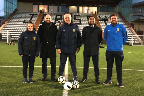 (L to R): Community Coach Lucy Even, Collas Crill partner Ian Montgomery, Jersey FA Football Development Manager Brian Oliver, Archie Irtizaali from Collas Crill and Community Coach Daniel Seviour