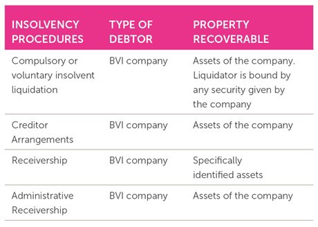 This note describes proceedings relating to assets located in the BVI. If the debtor’s assets are located outside the BVI, the ability of BVI insolvency procedures to access those assets will depend on the jurisdiction where the assets are based.